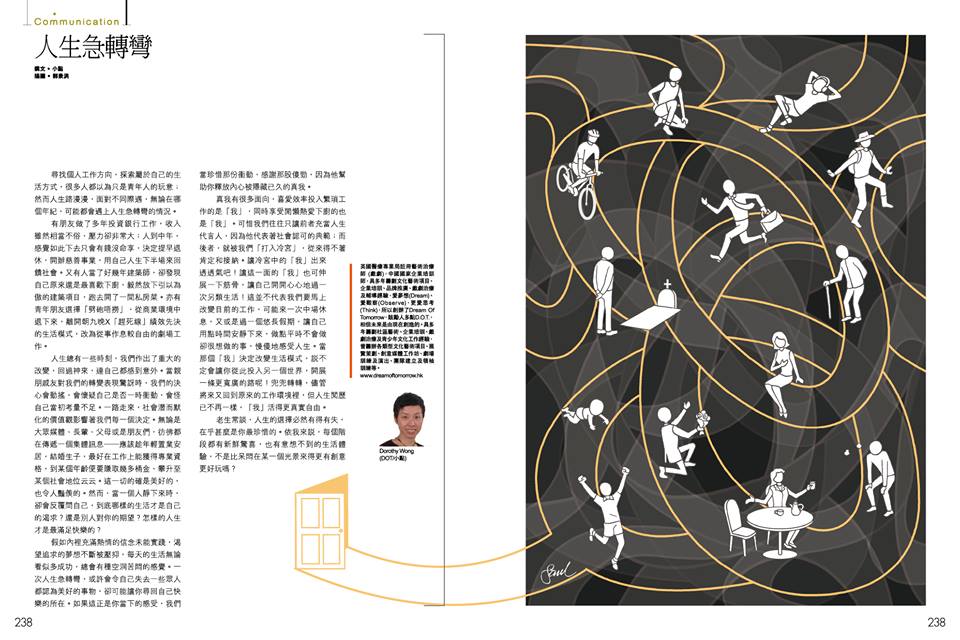 有朋友做了多年投資銀行工作,收入雖然相當不俗,壓力卻非常大;人到中年,感覺如此下去只會有錢沒命享,決定提早退休,開辦慈善事業,用自己人生下半場來回饋社會。又有人當了好幾年建築師,卻發現自己原來還是最喜歡下廚,毅然放下引以為傲的建築項目,跑去開了一間私房菜。亦有青年朋友選擇「劈砲唔撈」,從商業環境中退下來,離開朝九晚X「趕死線」績效先決的生活模式,改為從事作息較自由的劇場工作。
