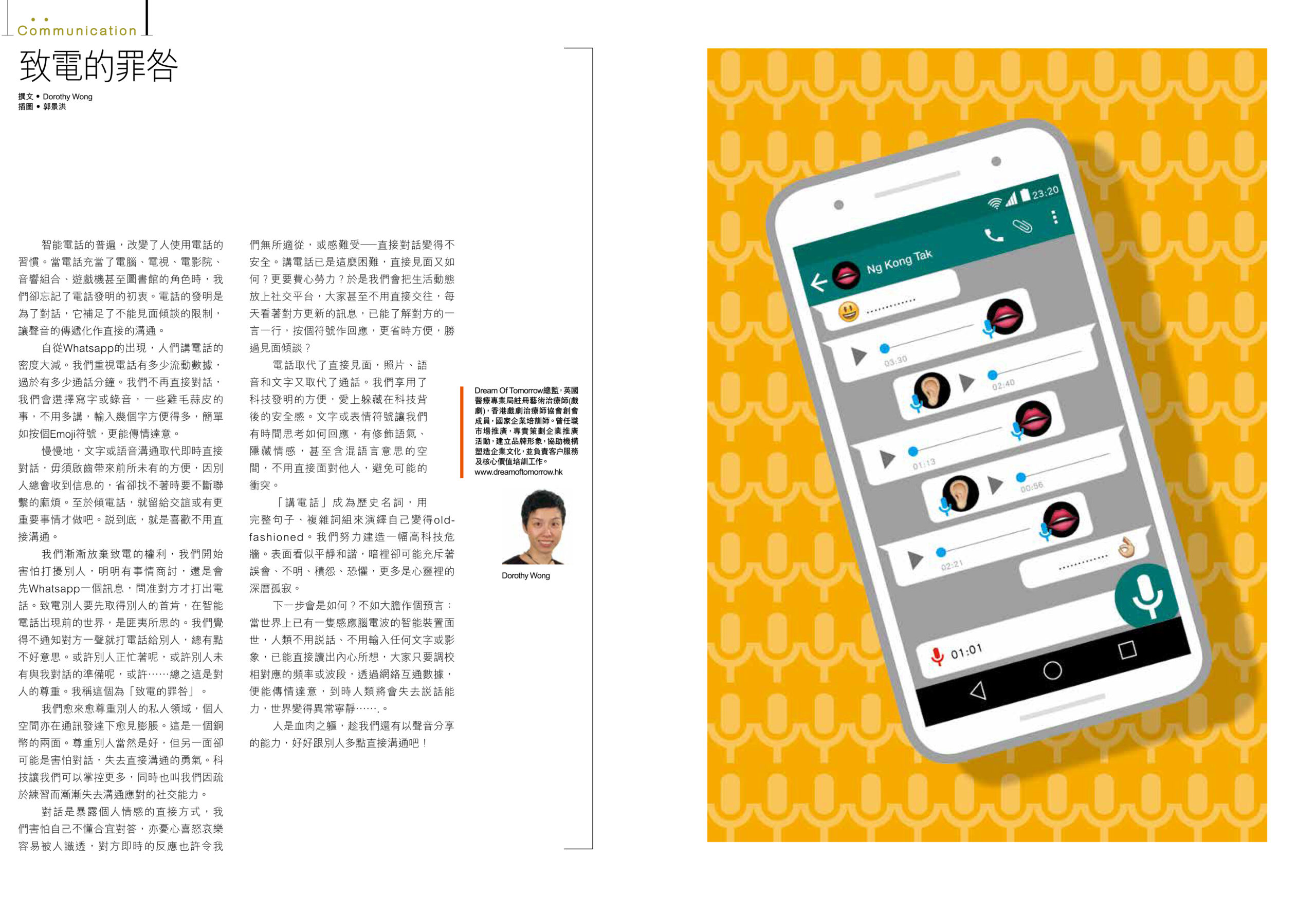 我們漸漸放棄致電的權利,我們開始害怕打擾別人,明明有事情商討,還是會先Whatsapp一個信息,問準對方才打出電話。致電別人要先取得別人的首肯,在智能電話出現前的世界,是匪夷所思的。我們覺得不通知對方一聲就打電話給別人,總有點不好意思。或許別人正忙著呢,或許別人未有與我對話的準備呢,或許……總之這是對人的尊重。我稱這個為「致電的罪咎」。